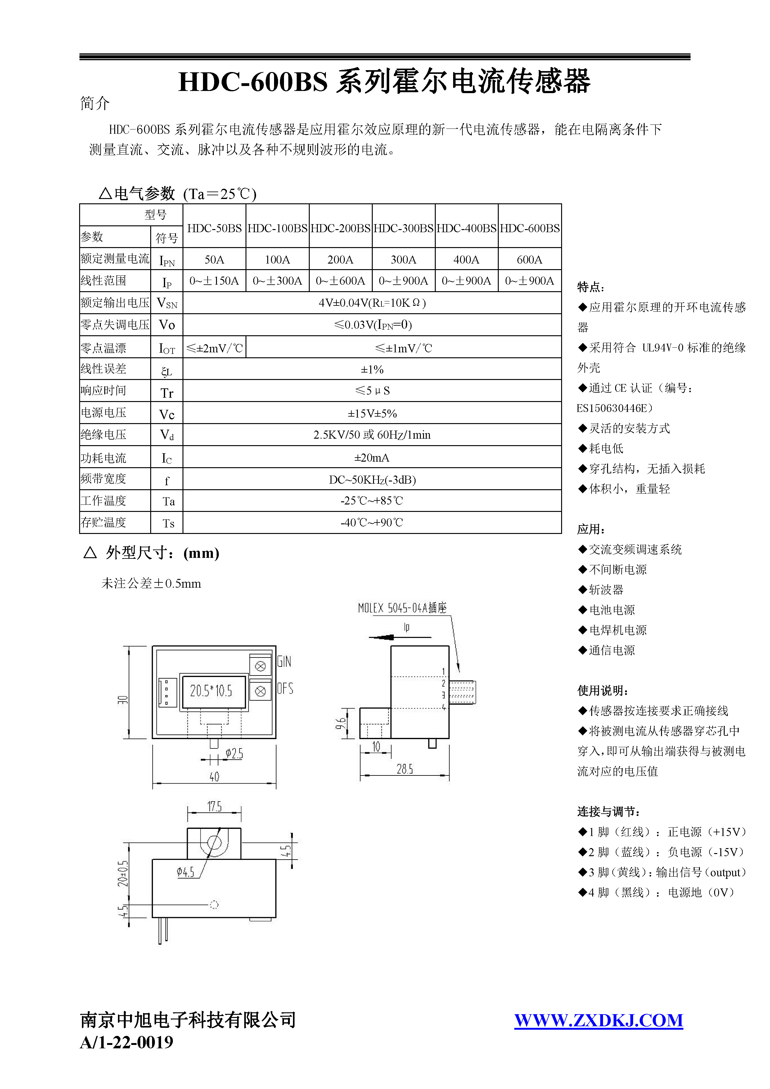 HDC-600BS系列霍爾電流傳感器是應用霍爾效應原理的新一代電流傳感器,能在電隔離條件下測量直流、交流、脈沖以及各種不規則波形的電流。